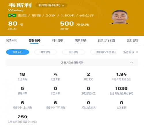 韦斯利现年20岁,场上司职边锋;本赛季他各项赛事出场18次,贡献4球2助攻,目前身价为500万欧元。